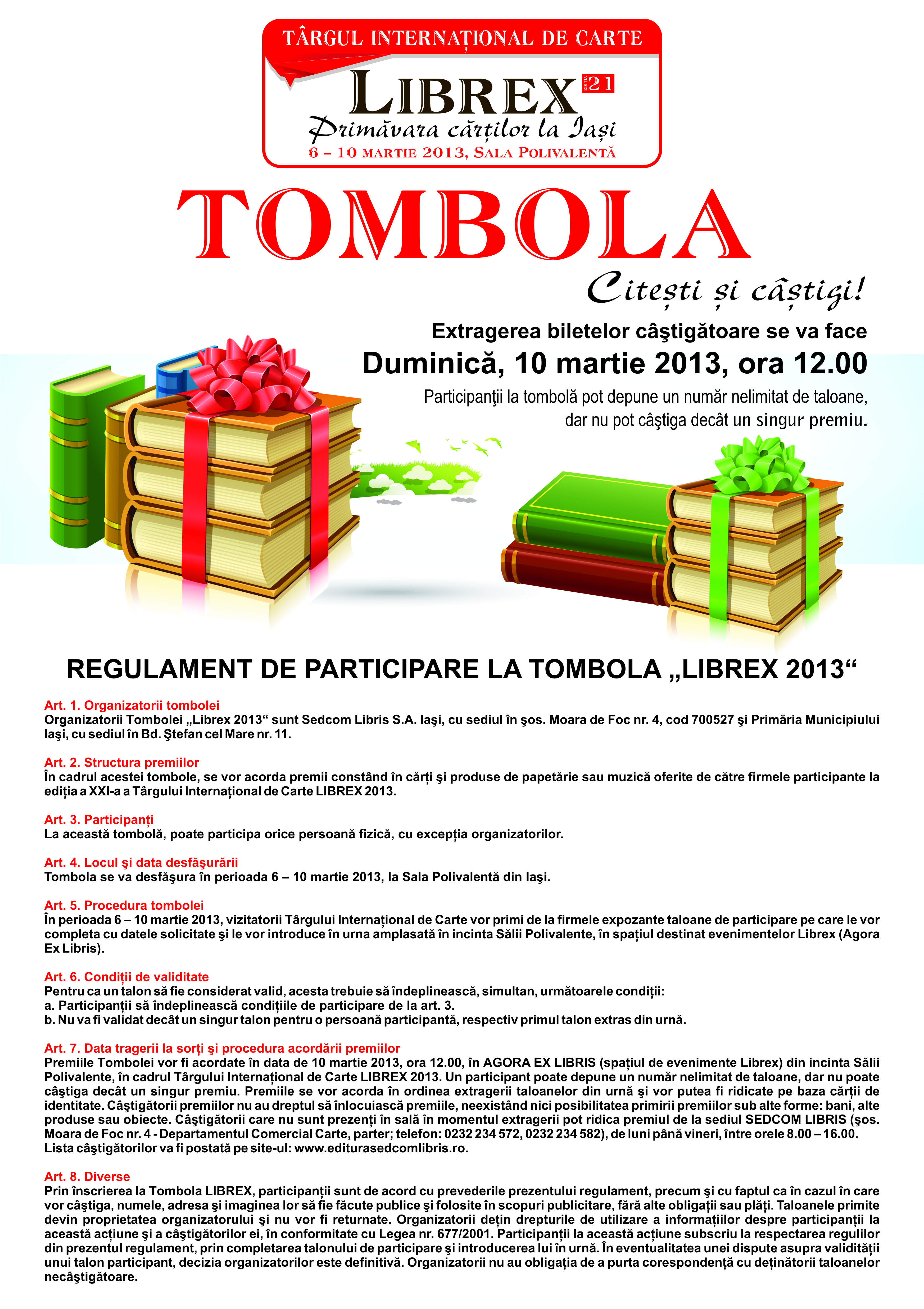 In fiecare primavara, la Iasi, Sedcom Libris, Organizatia Patronala AGORA a Societatilor pentru Difuzarea Tipariturilor si a altor Bunuri Culturale, impreuna cu Primaria Municipiului Iasi, in calitate de organizatori, in colaborare cu Prefectura Judetului Iasi, Consiliul Judetean Iasi, Muzeul Literaturii Romane, Uniunea Scriitorilor din Romania, filiala Iasi, readuc in atentia publicului Targul International de Carte Librex, considerat de specialisti, mass-media si public, un eveniment cultural de importanta nationala. Targul International de Carte Librex isi propune sa faciliteze cunoasterea diverselor programe editoriale si a tehnologiilor moderne de editare, tiparire si comunicare, sa promoveze si sa stimuleze adevarata valoare culturala, prin acordarea premiilor Librex, sa incurajeze relatiile dintre edituri, autori si publicul cititor, sa organizeze un program cultural complex: lansari de carte, intalniri cu scriitorii, dezbateri pe diverse teme etc.